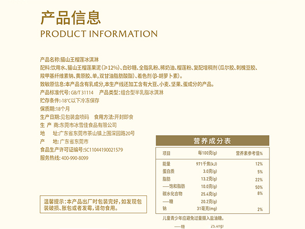 60克猫山王榴莲冰淇淋单支装
